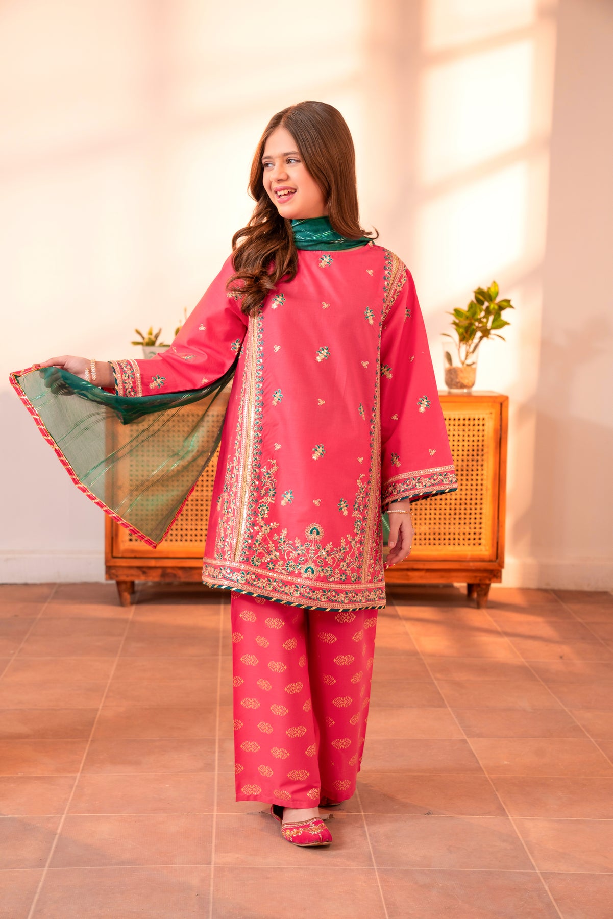 NOTE: From 9 to 12 has a short dupatta. From 13 to 18 size has a full dupatta of 2.5 y